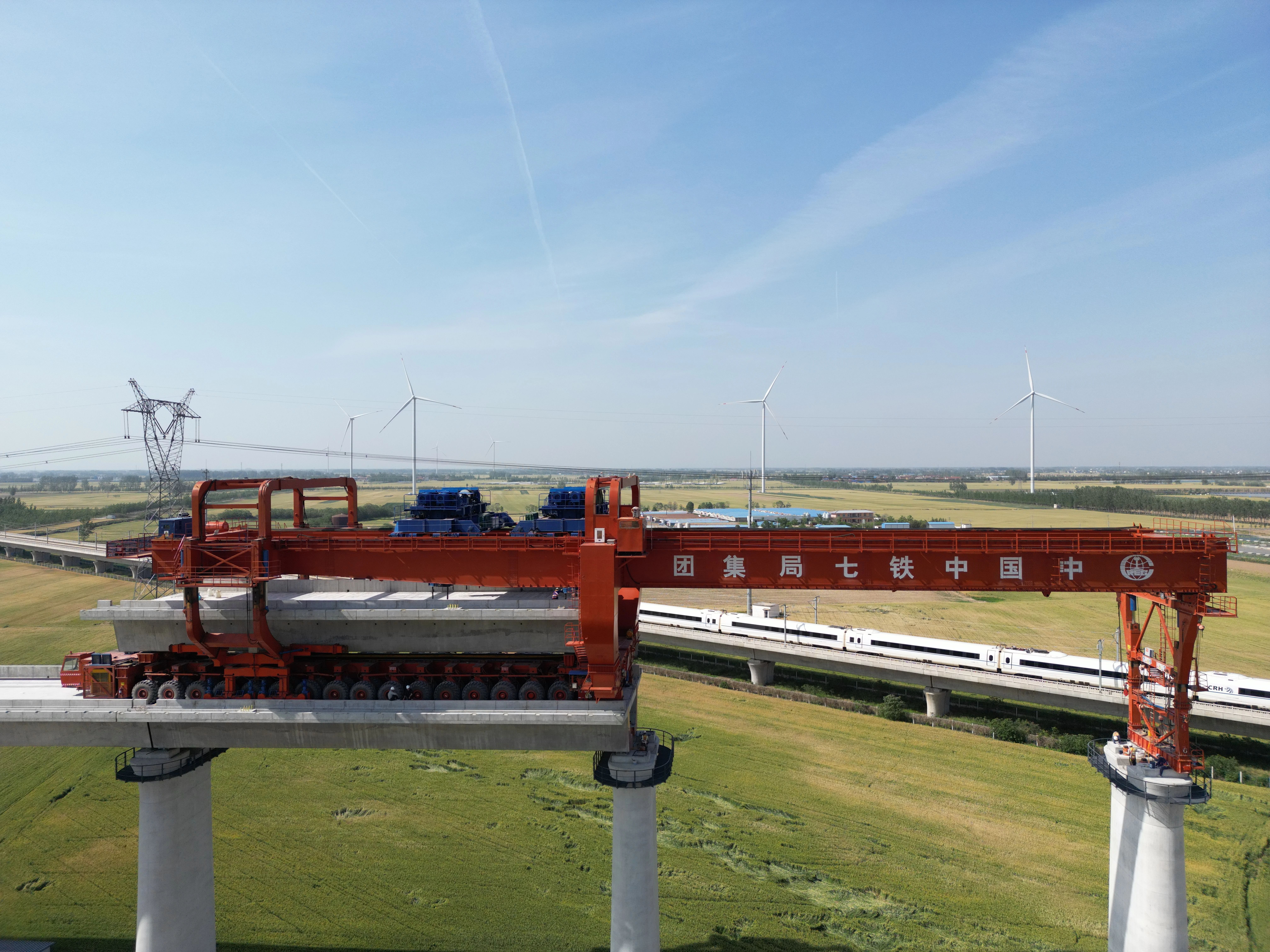 “旁邊就是鄭阜高鐵,為了保證施工中高鐵正常運(yùn)行,我們先在支架模板中建好橋墩和連續(xù)梁,再通過(guò)大橋轉(zhuǎn)體的方式,讓平漯周高鐵從它上方一‘跨’而過(guò)?!蓖跷目普f(shuō)話間,一列高鐵裹挾著熱風(fēng)疾馳遠(yuǎn)去。